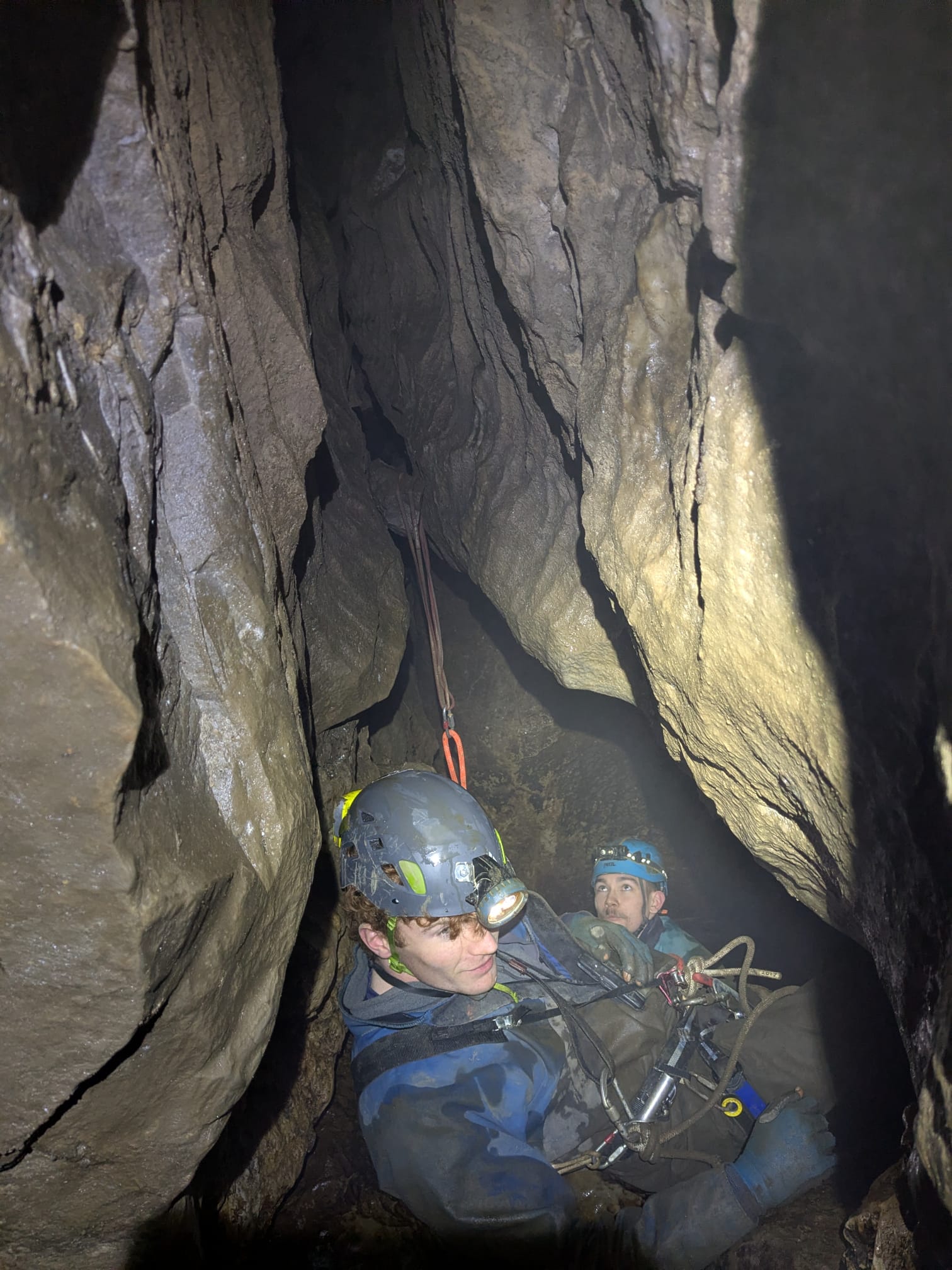 With a 30 minute delay we reached pitch one and this was the first encounter with Jean’s big naturals. There were some shiny bolts at the entrance, which did not reflect the state of the naturals encountered. The spike used for the descent was tiny and unsettling. In fear of falling and being hit in the head by rock I descended as quickly as possible. Tom followed, exclaiming “My nan can dress knots better than you”. How rude, I would like to see your nan hang off Jean’s naturals.