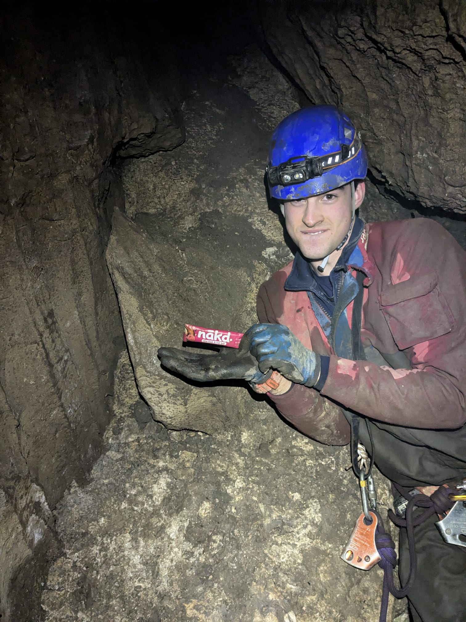 To our dismay the rear of Jean’s treasures were guarded by the 4th pitch. All the bolts here were spits. Free climbing the 9m pitch was not an option as it was narrow at the top and dropped into a large chamber. Body belaying and taking it in turns to bottom the cave was not a good one either. The best idea was to wedge a boulder at the top of the pitch to use as a natural belay but we did not want to spoil Jean’s natural beauty and potentially block the only way forward. A quick search for any spicy naturals left us scratching our heads and so after a short break (cannot go without Toby getting nakd) we decided to leave Jean alone.